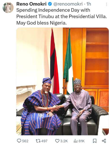 - Reno celebrated Nigeria’s Independence Day with President Tinubu at the Presidential Villa, expressing gratitude for the blessings of God.