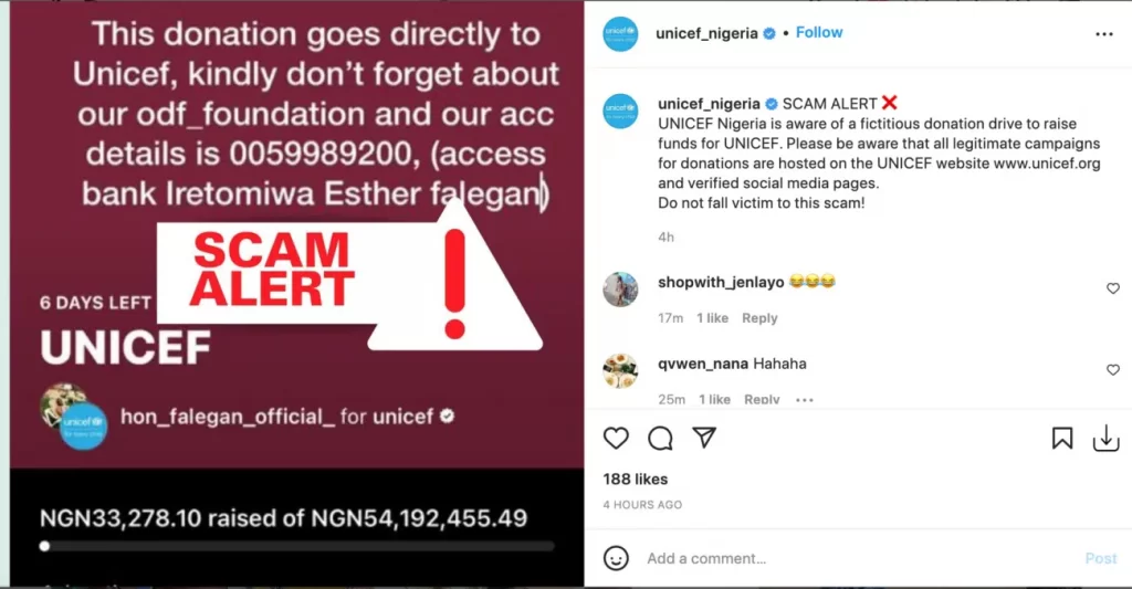 UNICEF urged the general public not to fall victim to the scam by Nkechi Blessing’s ex-love Opeyemi Falegan.