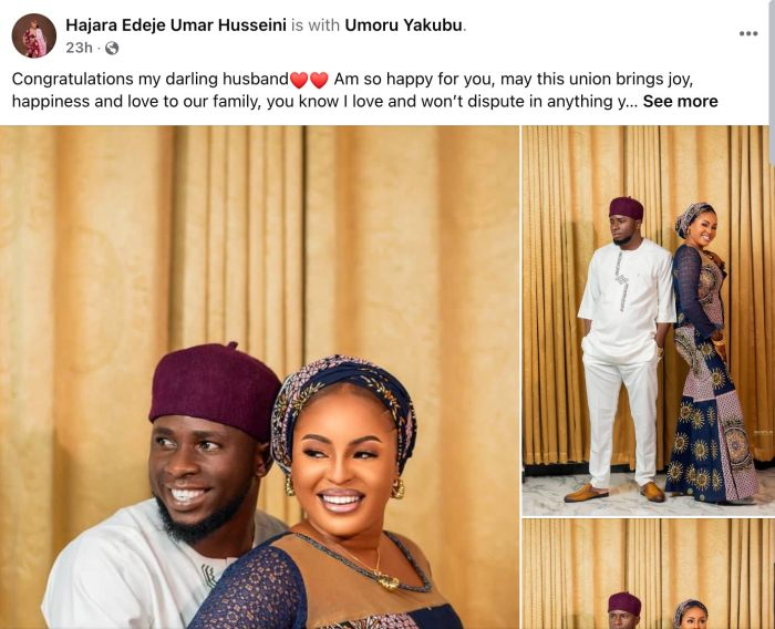 • Hajara Edeje Umar Husseini shared a heartfelt message and photos of her husband and his new bride.