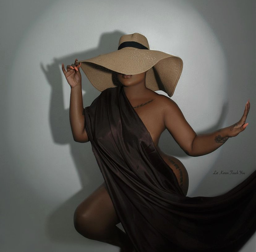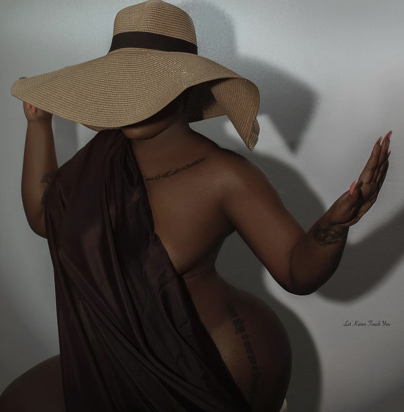 In the photos, Moet drapped a black satin material over her body, leaving much exposed. She hid her face with a large straw hat and captioned the photos: