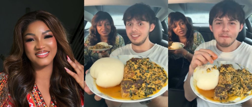 In the footage, Omotola, currently living in the United States, served content creator @yoeats23 a traditional meal of pounded yam accompanied by kponmo and Egusi soup.