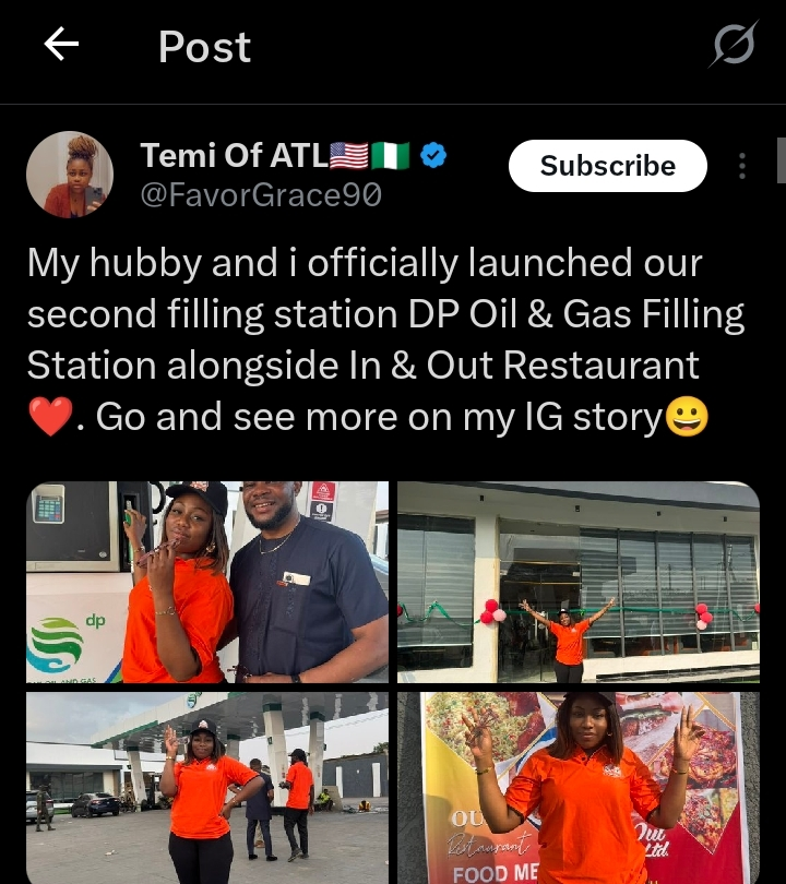 Her post included photos of their filling station, which has received numerous congratulatory messages from X users.