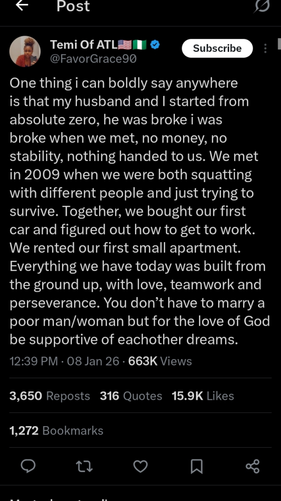 The wife, known as @FavourGrace09 on X (formerly Twitter), shared their story, revealing that when they met, both were broke and squatting with different people just to survive.