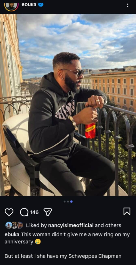 In his usual playful style, Ebuka later took to social media to humorously “call out” his wife for not returning the extravagant gesture. Posting pictures of himself enjoying a Schweppes drink, he jokingly complained that she hadn’t given him a new ring in celebration.