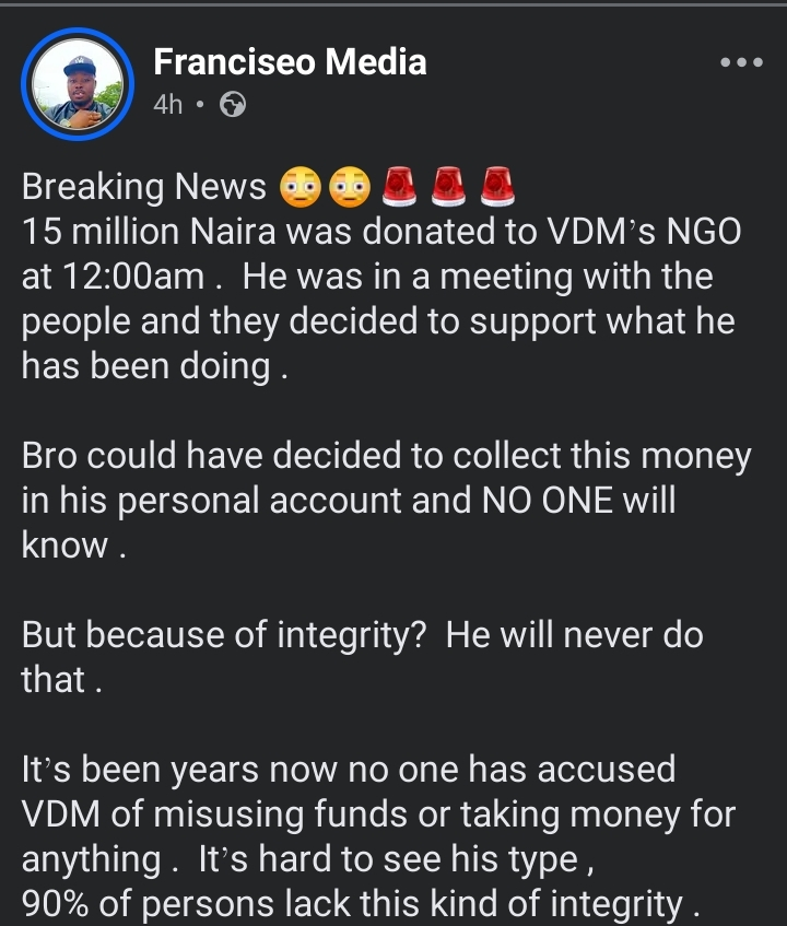 The man identified with the Facebook handle, Franciseo Media disclosed that ₦15 million was donated to VeryDarkMan’s NGO account in the early hours of April 3, 2026.