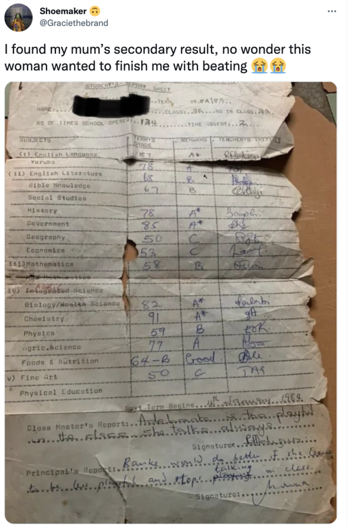 Taking to her personal social media handle on the popular micro-blogging platform, Twitter, this social media user with the name, @Graciethebrand shared a copy of her mother’s school results and added the caption;