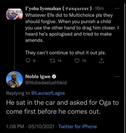 Igwe served a response after a Twitter user asked why Multichoice has allegedly shut Efe out even though he has “apologized and tried to make amends.”