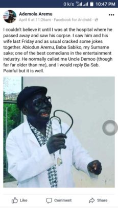 Abiodun Aremu, Baba Sabiko, my Surname sake; one of the best comedians in the entertainment industry. He normally called me Uncle Demoo (though far far older than me), and I would reply Ba Sab. Painful but it is well.