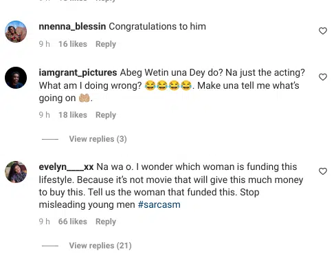 “Na wa o. I wonder which woman is funding this lifestyle. Because it’s not a movie that will give this much money to buy this. Tell us the woman that funded this. Stop misleading young men” one Evelyn reacted on Instagram.