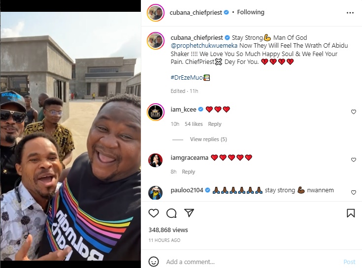 “Stay Strong💪 Man Of God @prophetchukwuemeka Now They Will Feel The Wrath Of Abidu Shaker !!!! We Love You So Much Happy Soul & We Feel Your Pain. ChiefPriest☠️ Dey For You. 💔💔💔💔”. Cubana wrote.