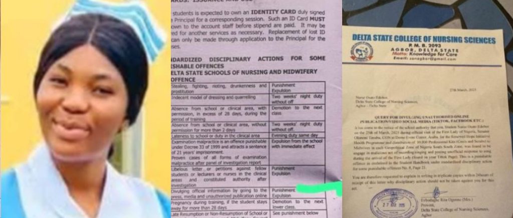 Osato Edobor, a student at the Delta State School of Nursing, who was previously interrogated for allegedly disseminating an ‘unauthorized’ video on social media during the visit of Nigeria’s First Lady, Senator Oluremi Tinubu, has reportedly failed her final examination.