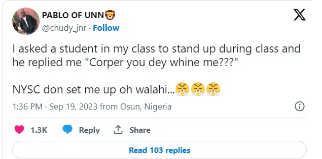 “I asked a student in my class to stand up during class and he replied me ‘Corper you dey whine me???’ NYSC don set me up oh walahi…😤😤😤.”