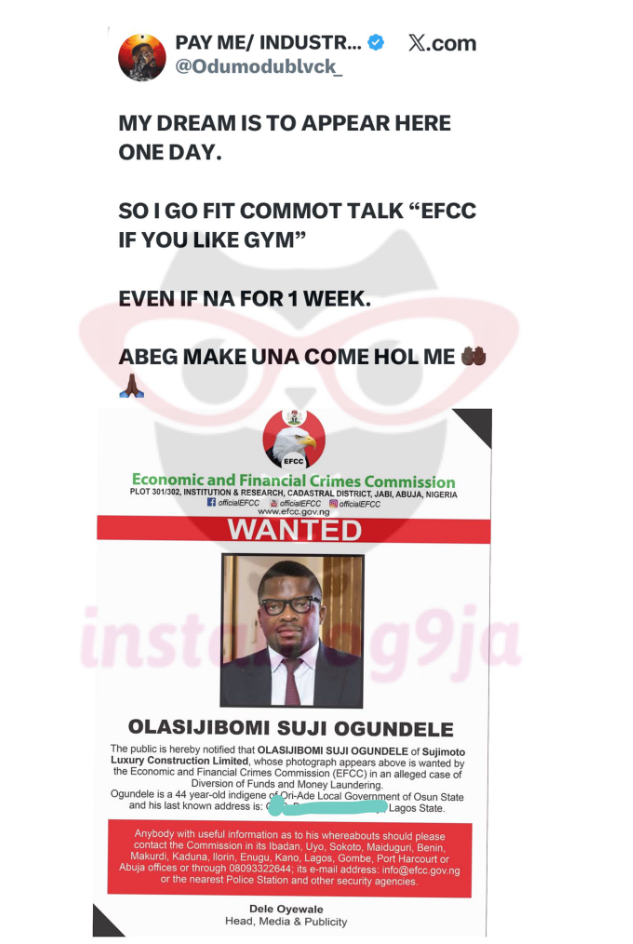 In his post, Odumodublvck said it would be a personal milestone for him if his name ever appeared on an EFCC wanted flier, even if it was just for a week. He joked that this would allow him to say, “EFCC if you like gym”, before asking the anti-graft agency to “come hold him” for the experience.