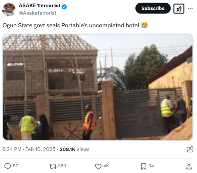 Controversial Nigerian artist Habeeb Olalomi Badmus, also known as Portable, has reportedly faced another setback after the Ogun State government allegedly blocked off his unfinished hotel.