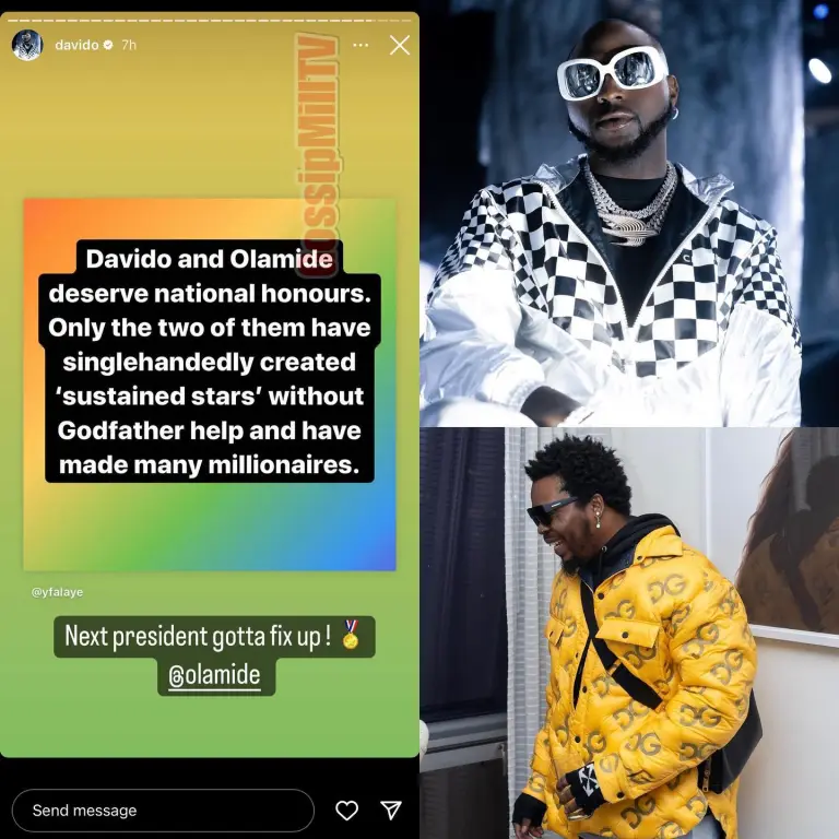 The post reads; ”Davido and Olamide deserve national honours. Only the two of them have singlehandedly created ‘sustained stars’ without Godfather help and have made many millionaires.”