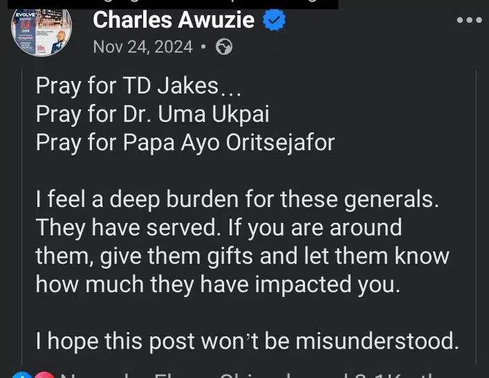 The resurfaced post, originally shared by Charles Awuze on November 24, 2024, reflected a heartfelt concern for several influential Christian leaders. In the post, Awuze named Dr. Uma Ukpai, Bishop T.D. Jakes, and Papa Ayo Oritsejafor as spiritual generals he felt a strong burden to pray for.