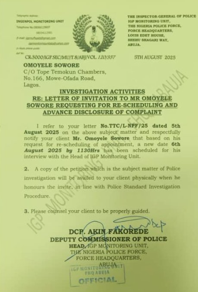 Sowore had been detained the previous day after reportedly honoring an invitation from the IGP Monitoring Unit.