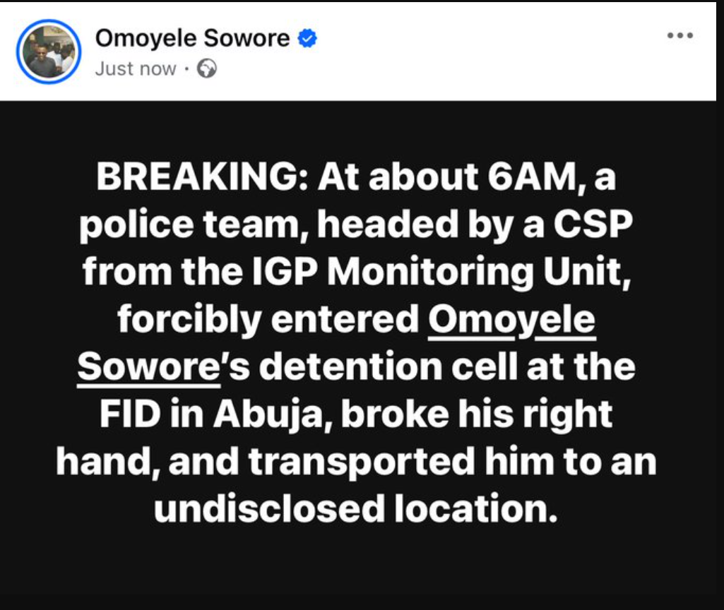 “At about 6AM, a police team, headed by a CSP from the IGP Monitoring Unit, forcibly entered Omoyele Sowore’s detention cell at the FID in Abuja, broke his right hand, and transported him to an undisclosed location,” the post stated.