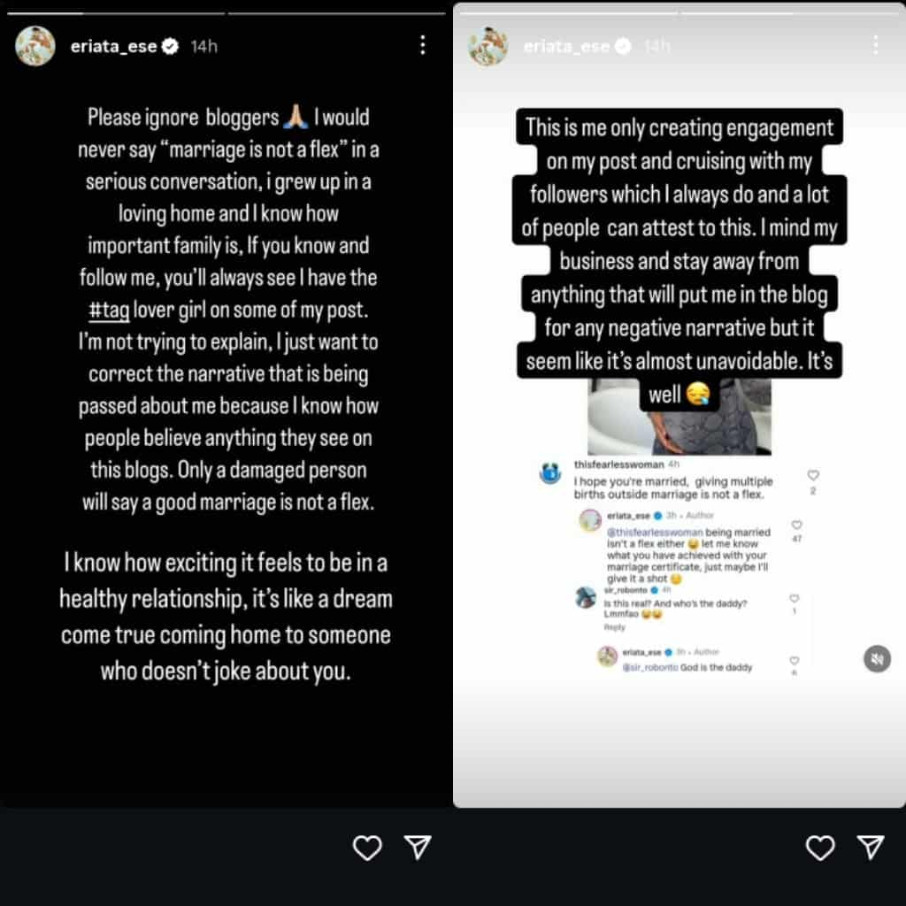 In a post on her Instagram story, Eriata said she will never say marriage isn’t a flex in a serious conversation. She wrote: