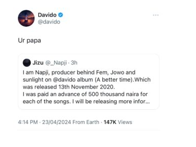 I was paid an advance of 500 thousand naira for each of the songs. I will be releasing more information as I seek to collect my royalties & publishing,” Napji the producer wrote.