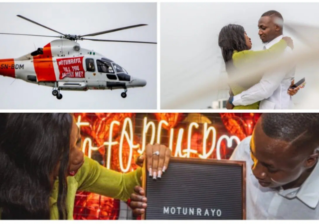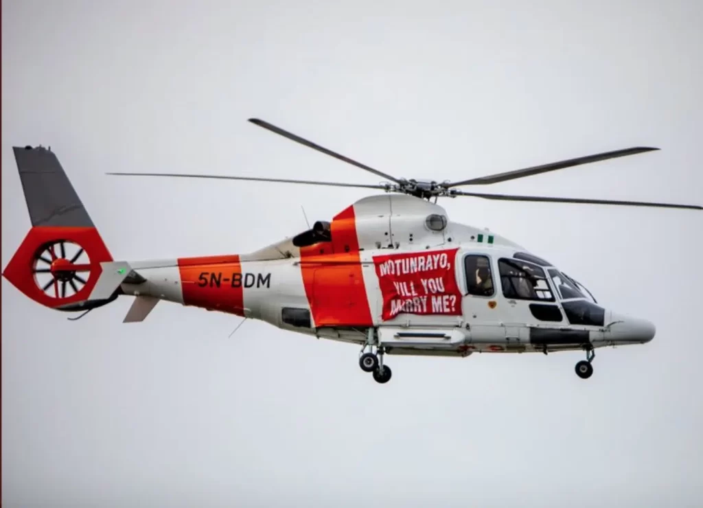 Nigerian Twitter Influencer Pamilerin Adegoke has caused a stir online after proposing to his girlfriend with a helicopter.