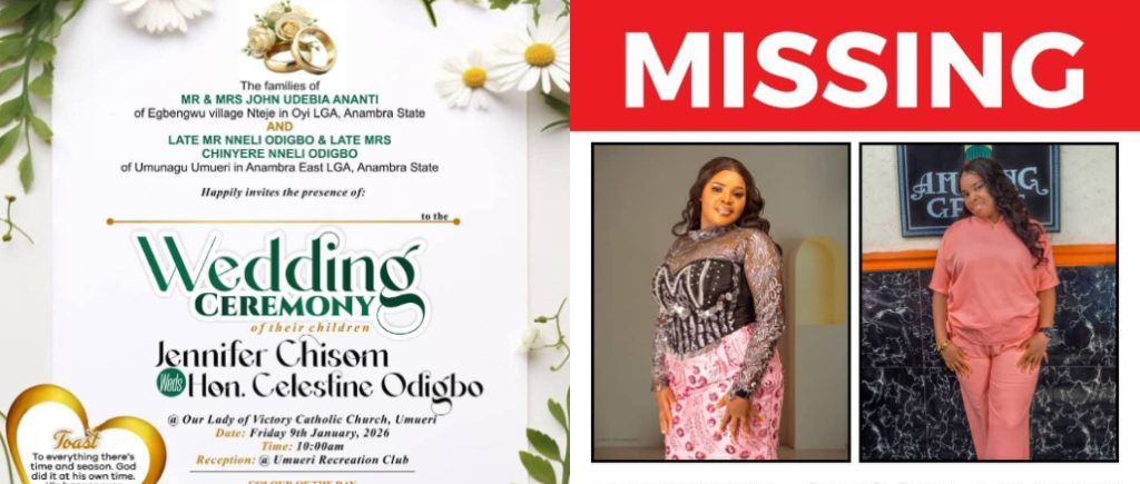 - A wedding in Anambra State was thrown into chaos after the bride-to-be, Jennifer Chisom Ananti, went missing on the morning of her wedding to Celestine Odigbo on Friday, January 9, 2026.