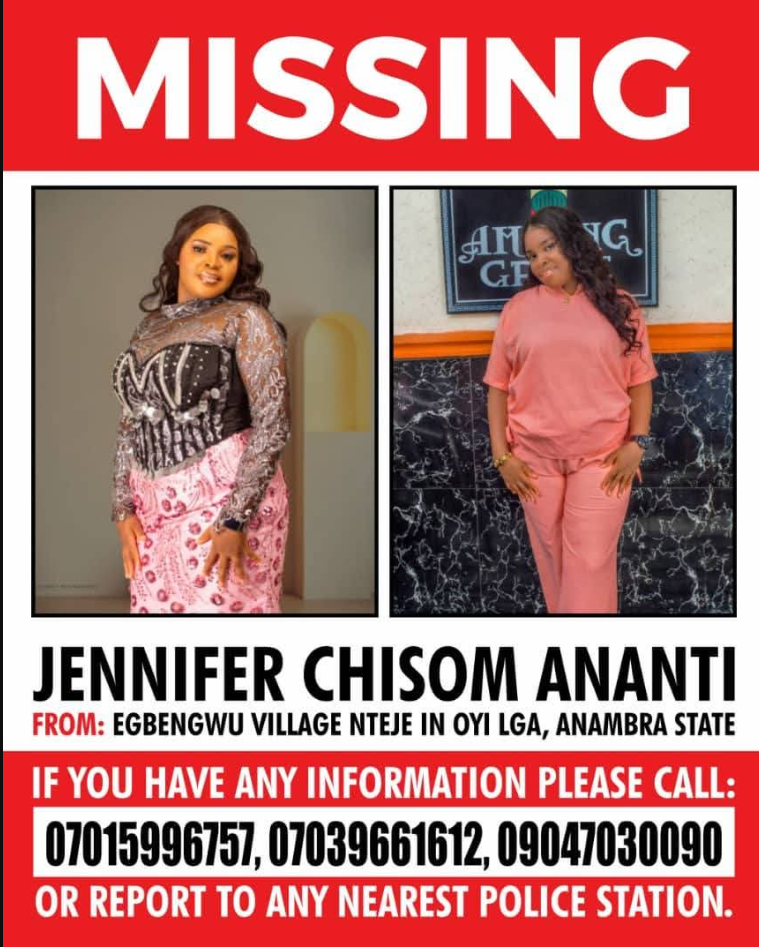 A “Missing Person” poster featuring Jennifer’s photograph is currently circulating on social media platforms, with the family and security agencies appealing to the public for any information regarding her whereabouts.