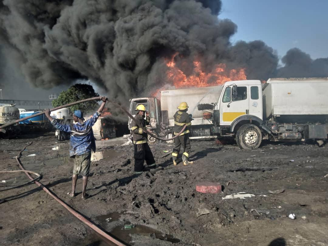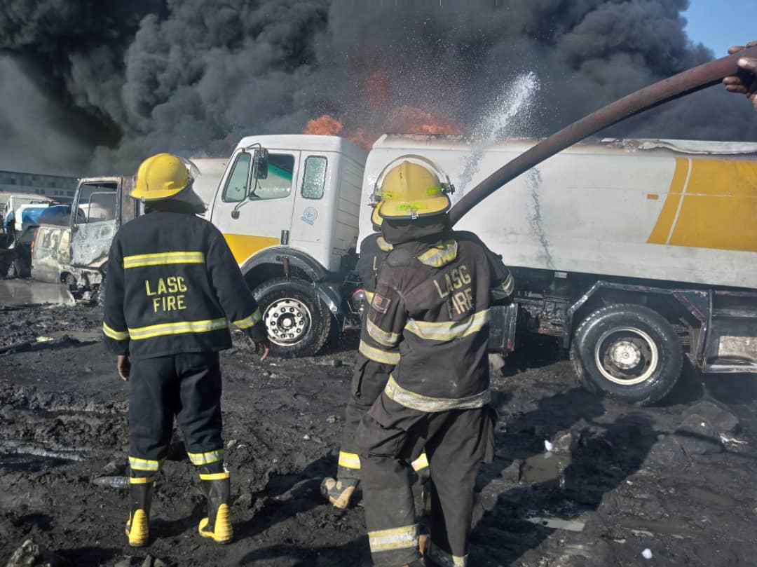 Men of the Lagos State Fire and Rescue Service are presently combating intense Fire at an articulated Motor Park, in Otto Wharf, Mile 2 area of Lagos state.