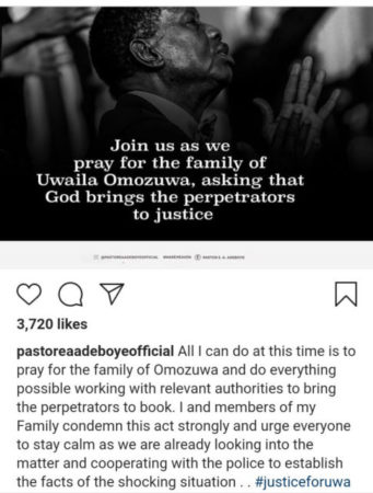 Pastor E.A. Adeboye has reacted to the rape and murder ofUNIBEN undergraduate, Uwa Omozuwa in one of the branches of his church, RCCG.