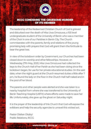 The Redeemed Christian Church of God also released a statement. In it, they explained why Uwa was in church during the lockdown, how she was found, and the actions taken after she was found lying in the pool of her blood.