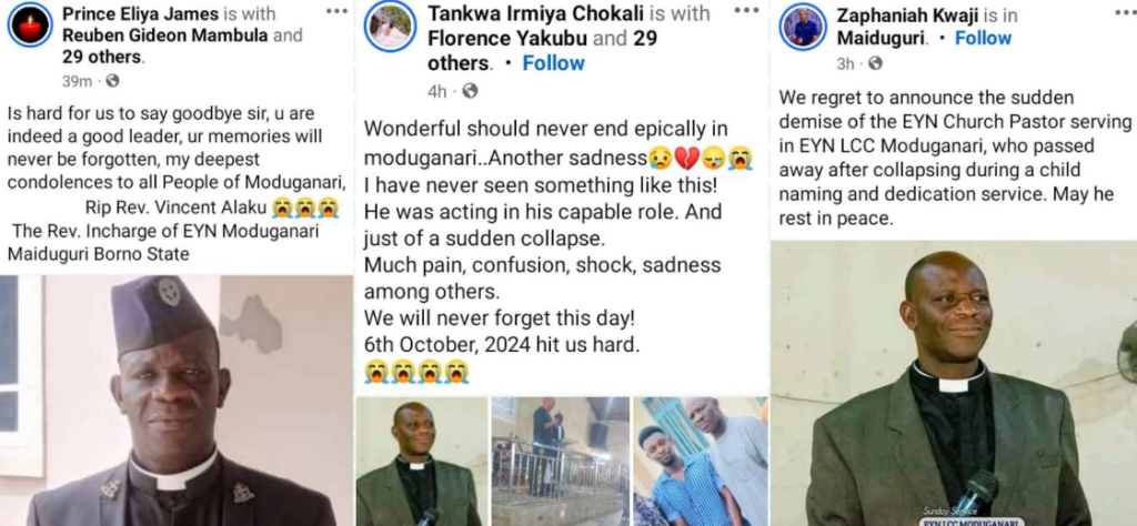“We regret to announce the sudden demise of the EYN Church Pastor serving in EYN LCC Moduganari, who passed away after collapsing during a child naming and dedication service. May he rest in peace,” one Zaphaniah Kwaji wrote.