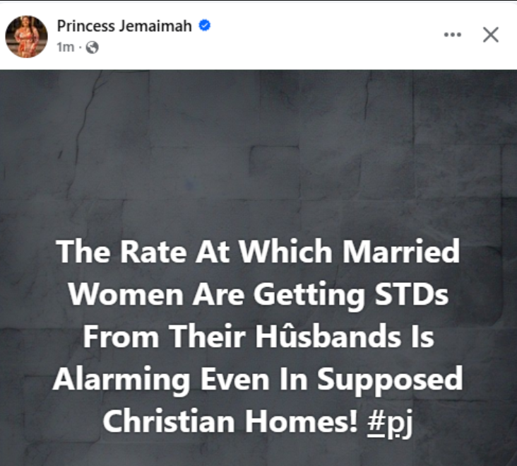 In a heartfelt Facebook post on Tuesday, she wrote, “The rate at which married women are getting STDs from their husbands is alarming, even in supposed Christian homes.”