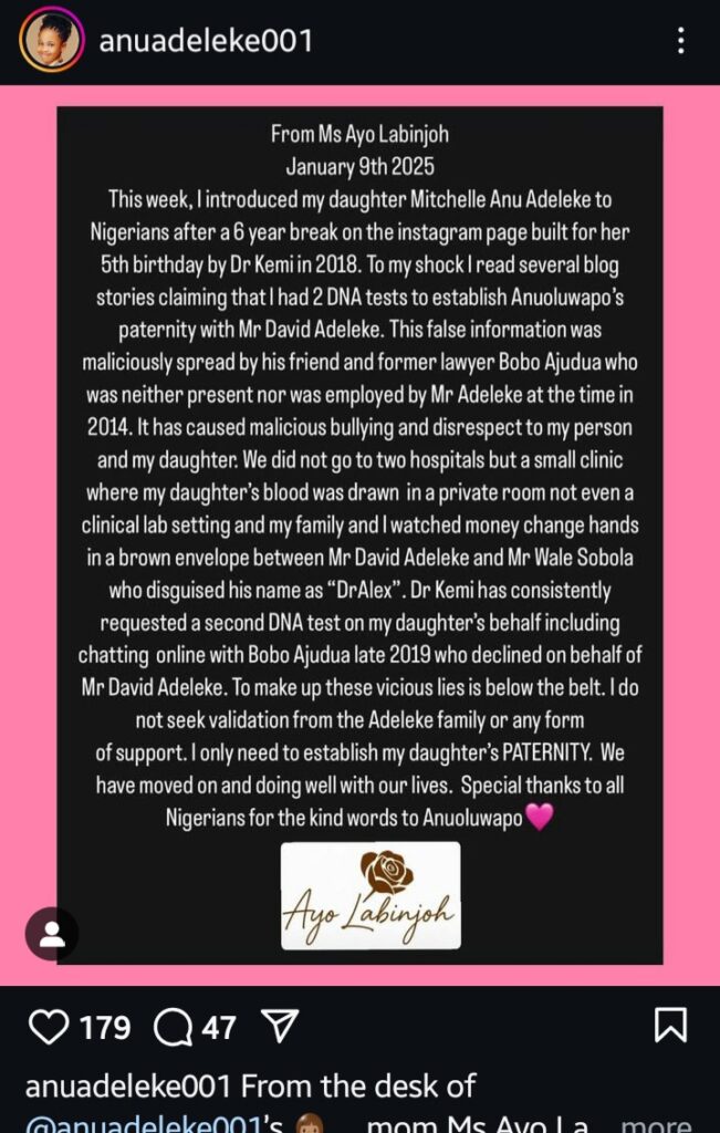 “This week, I introduced my daughter Mitchelle Anu Adeleke to Nigerians after a 6 year break on the instagram page built for her 5th birthday by Dr Kemi in 2018. To my shock I read several blog stories claiming that I had 2 DNA tests to establish Anuoluwapo’s paternity with Mr David Adeleke.