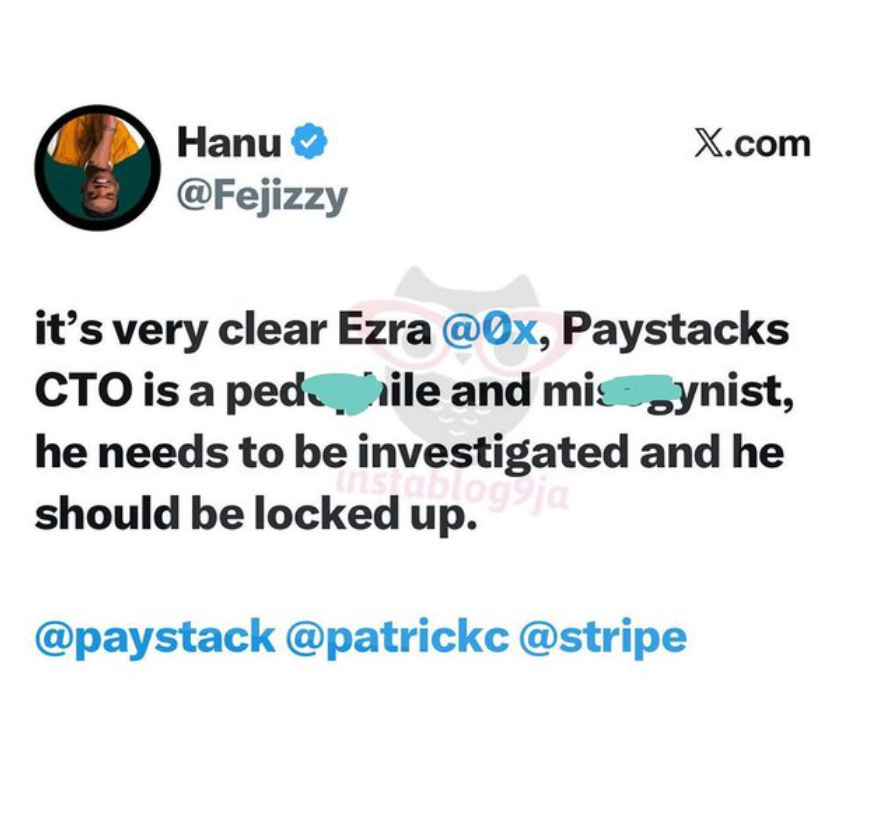 In his post, Hanu, whose X handle is @Fejizzy, made extremely severe and uncensored allegations against the Paystack CTO. He claimed that Ezra Olubi is involved in serious criminal behavior and misogyny, stating: