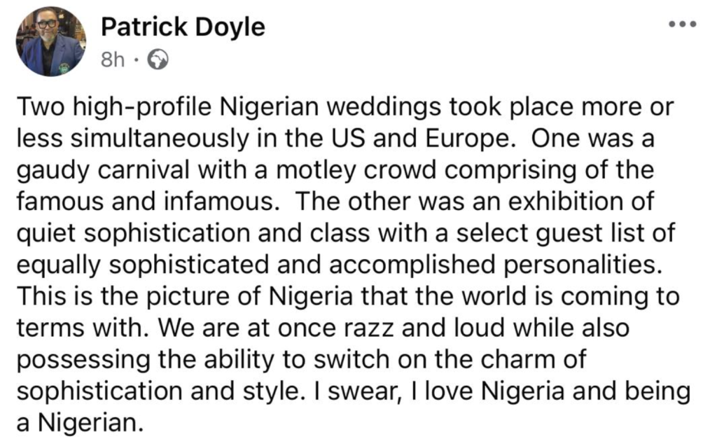 - Media personality Patrick Doyle compared two recent Nigerian weddings held in the US and Europe, describing one as a gaudy carnival with a mixed crowd and the other as a display of quiet sophistication and class.