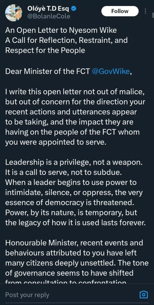 - Oloye T.D, Esq., a human rights advocate, wrote an open letter to FCT Minister Nyesom Wike.
