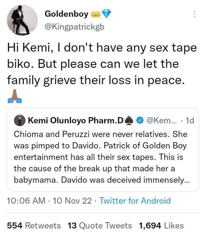 “Hi Kemi, I don’t have any sex tape biko. But please can we let the family grieve” their loss in peace.