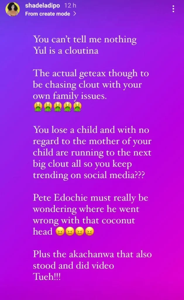 Shade Ladipo, a media figure, has joined the fray, dragging Yul Edochie through the mud.