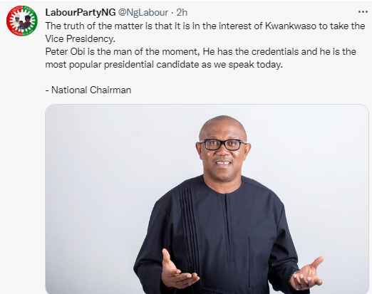 In a tweet posted on the party’s handle this evening, the Party chairman was quoted as saying it would be in Kwankwaso’s interest to run with Peter Obi who ”is the man of the moment- Labor party chairman”