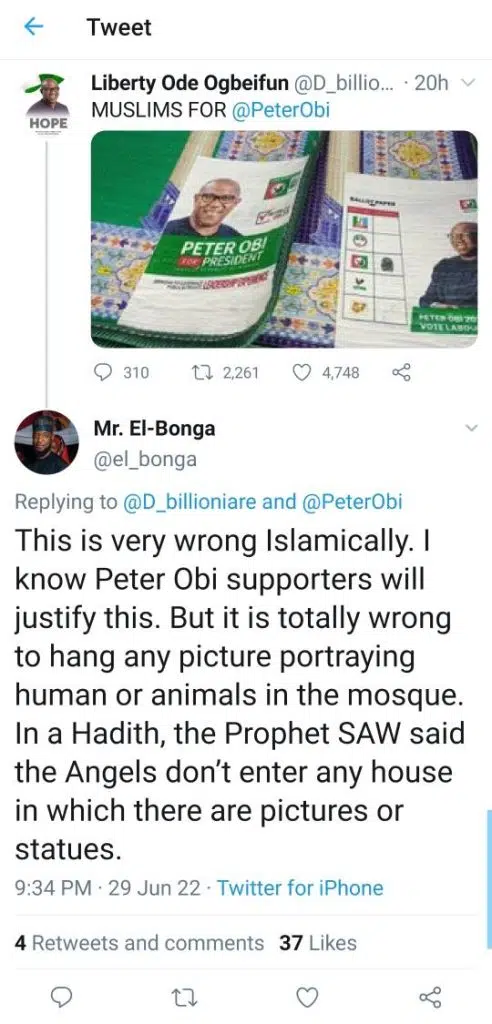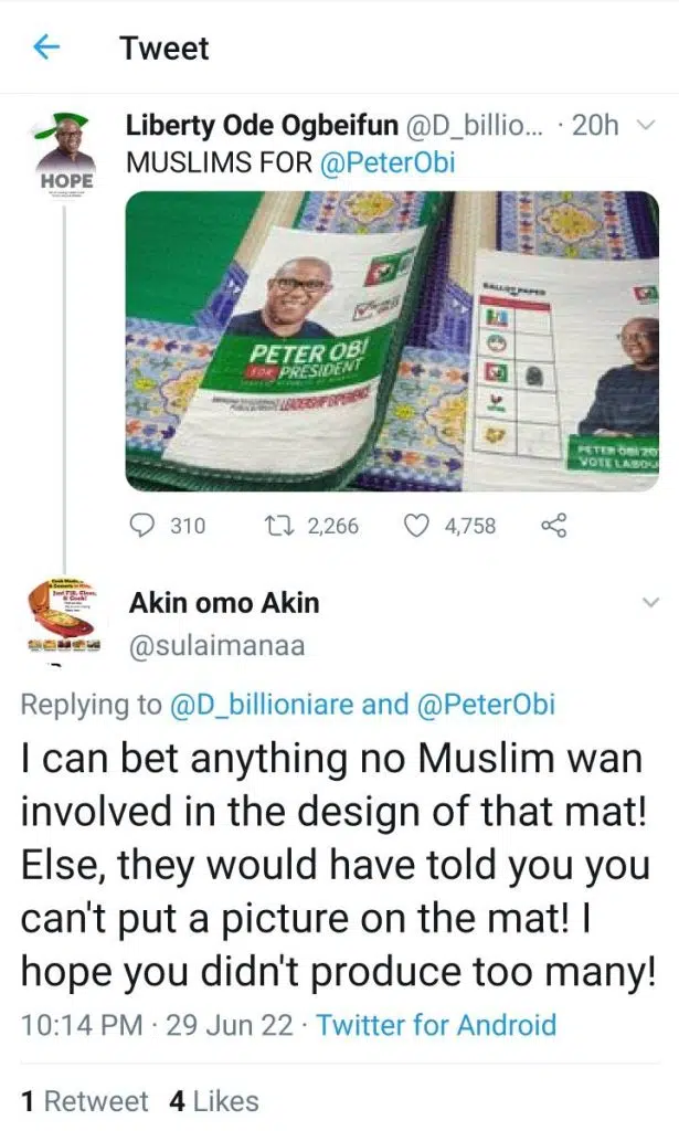 Presidential candidate of the Labour Party, Peter Obi has put out a disclaimer following a controversial campaign poster on a branded praying mat.