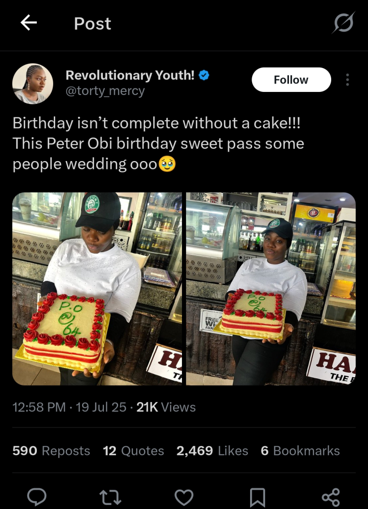 “Birthday isn’t complete without a cake!!! This Peter Obi birthday sweet pass some people wedding ooo🥹”