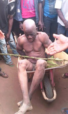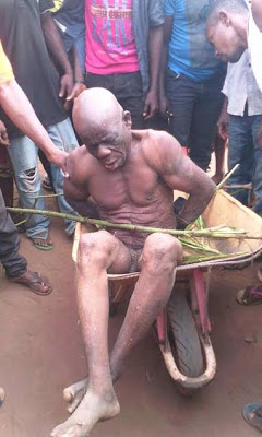 ‘THE MAN YOU’RE SEEING HERE NAK*D IS MR GABON IYIAKA FROM UMUDIOPARA UMUNAKANU OWERRI. IN EHIME MBANO LGA.HE WAS CAUGHT WITH CHARM TODAY AT CHIEF MARCEL NNODIM’S (MARLEY) HOUSE WHEN HE WAS ATTEMPTING TO PLANT THE CHARM AT MARLEY’S HOUSE IN THE SAME UMUDIOPARA. MR GABON USED THE KEY HIS NATIVE DOCTOR GAVE HIM TO LOCK CHIEF.MARLEY NNODIM’S HOUSE BEFORE HE WAS CAUGHT.