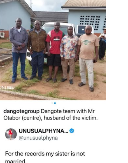 - The clarification comes amid ongoing conversations about the accident in Auchi, Edo State, involving a truck linked to the Dangote Group, which left her sister injured and led to public calls for accountability.