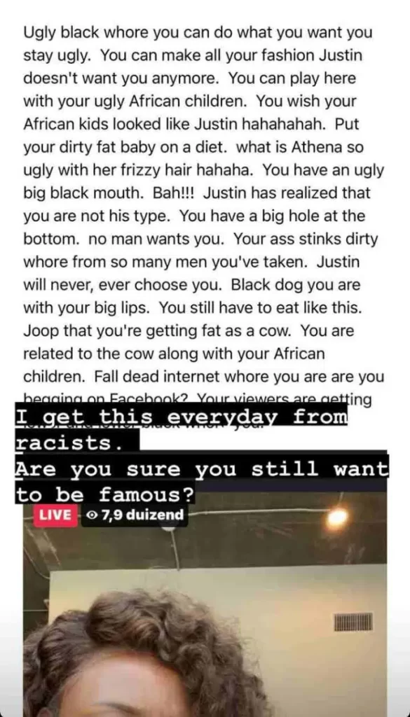 “I get this everyday from racists. Are you sure you still want to be famous, she wrote”