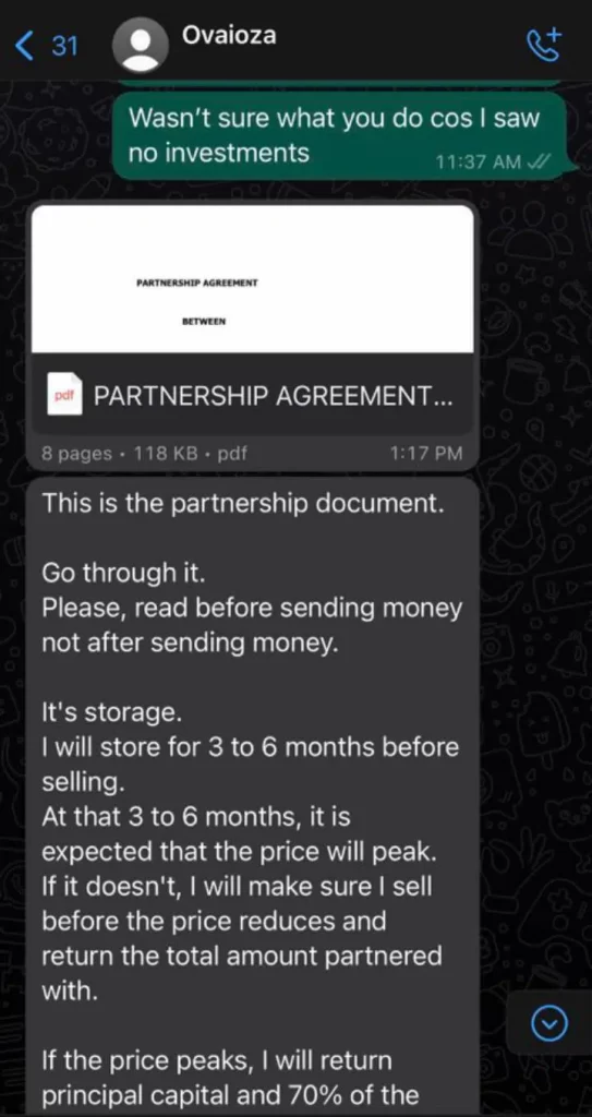 “She runs a storage business as a front. People were asked to invest to get returns.