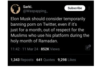 “Elon Musk should consider temporarily banning porn on Twitter, even if it’s just for a month, out of respect for the Muslims who use his platform during the holy month of Ramadan.”