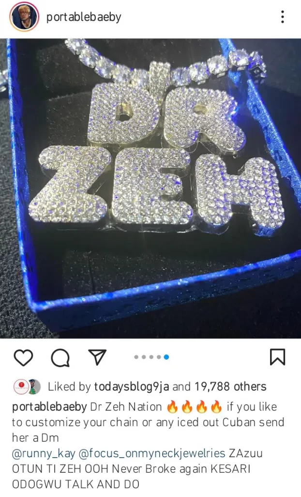 Fast-rising Nigerian singer, Habeeb Okikiola popularly known as Portable has splashed millions on a customized chain weeks after bagging huge endorsement deal.