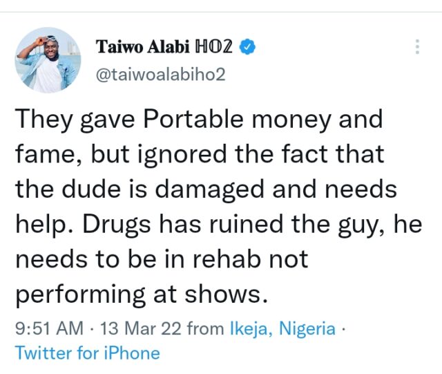 Taiwo Alabi Possibly reacting to this, has said that Portable needs help since druggs have damaged him.