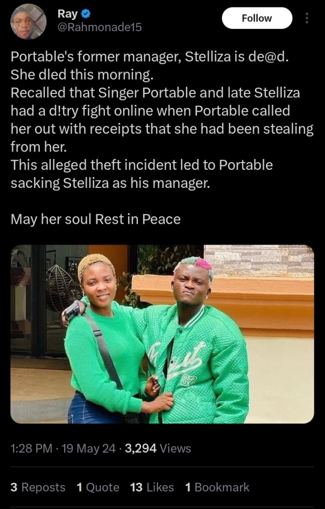 Stelliza, the former manager of Portable, has tragically passed away, as confirmed by a social media user. The report indicates that she died in the early hours of Sunday.