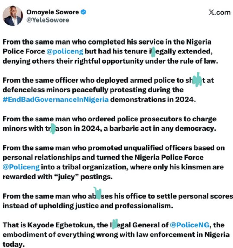 Responding via his verified X handle, Omoyele Sowore accused the Inspector-General of contradicting his own message, alleging that Egbetokun’s conduct within the Nigeria Police Force violates the very principles he preached.